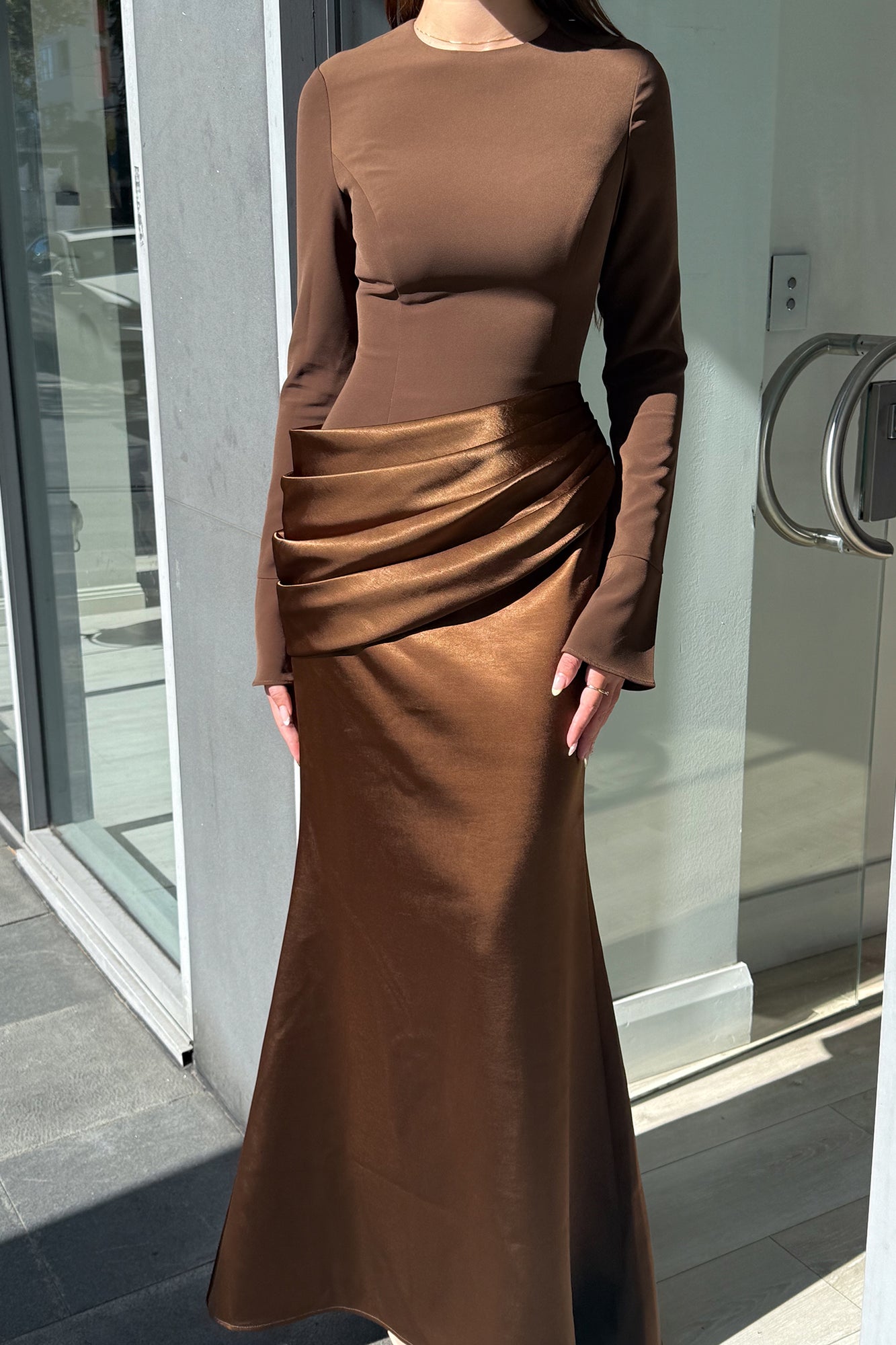 The top is crafted from a premium blend of viscose and spandex for a structured yet flattering finish, fully lined with satin for that soft touch against the skin. The bottom is made from 100% Dutchess satin with a rich, glossy drape that flows gracefully with every step.