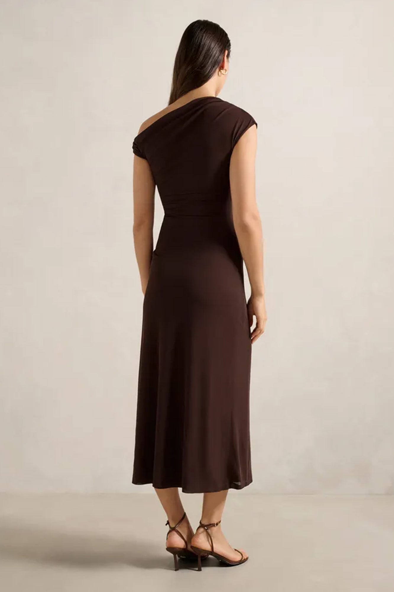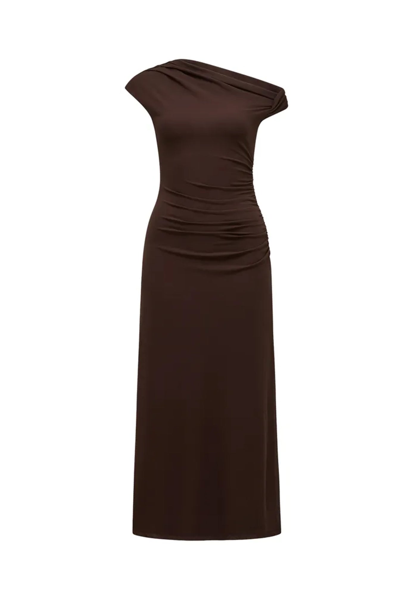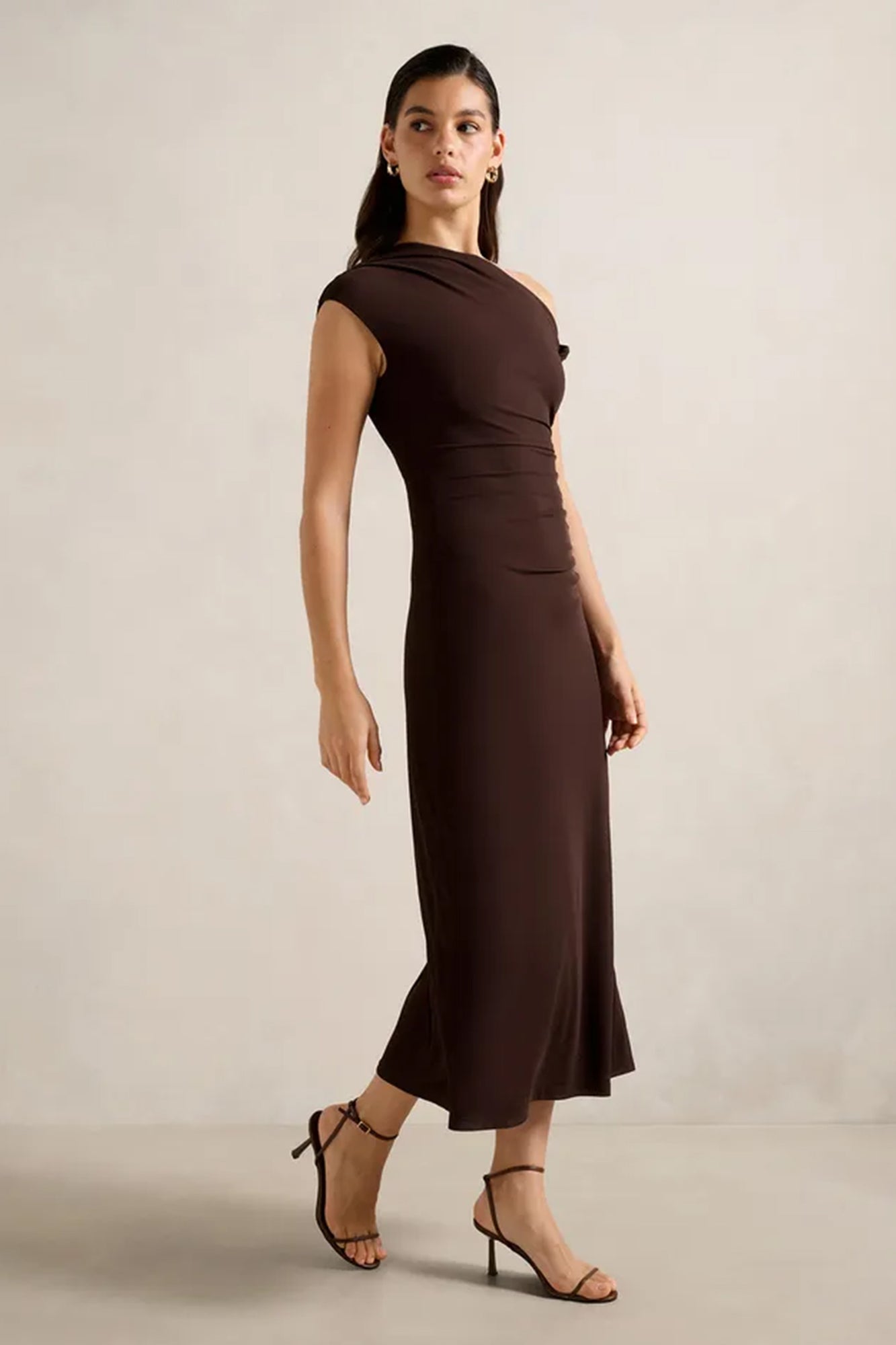 A form-flattering midi dress to style with matching heels and gold-tone accessories, perfect for gala evenings and wedding guest styling.