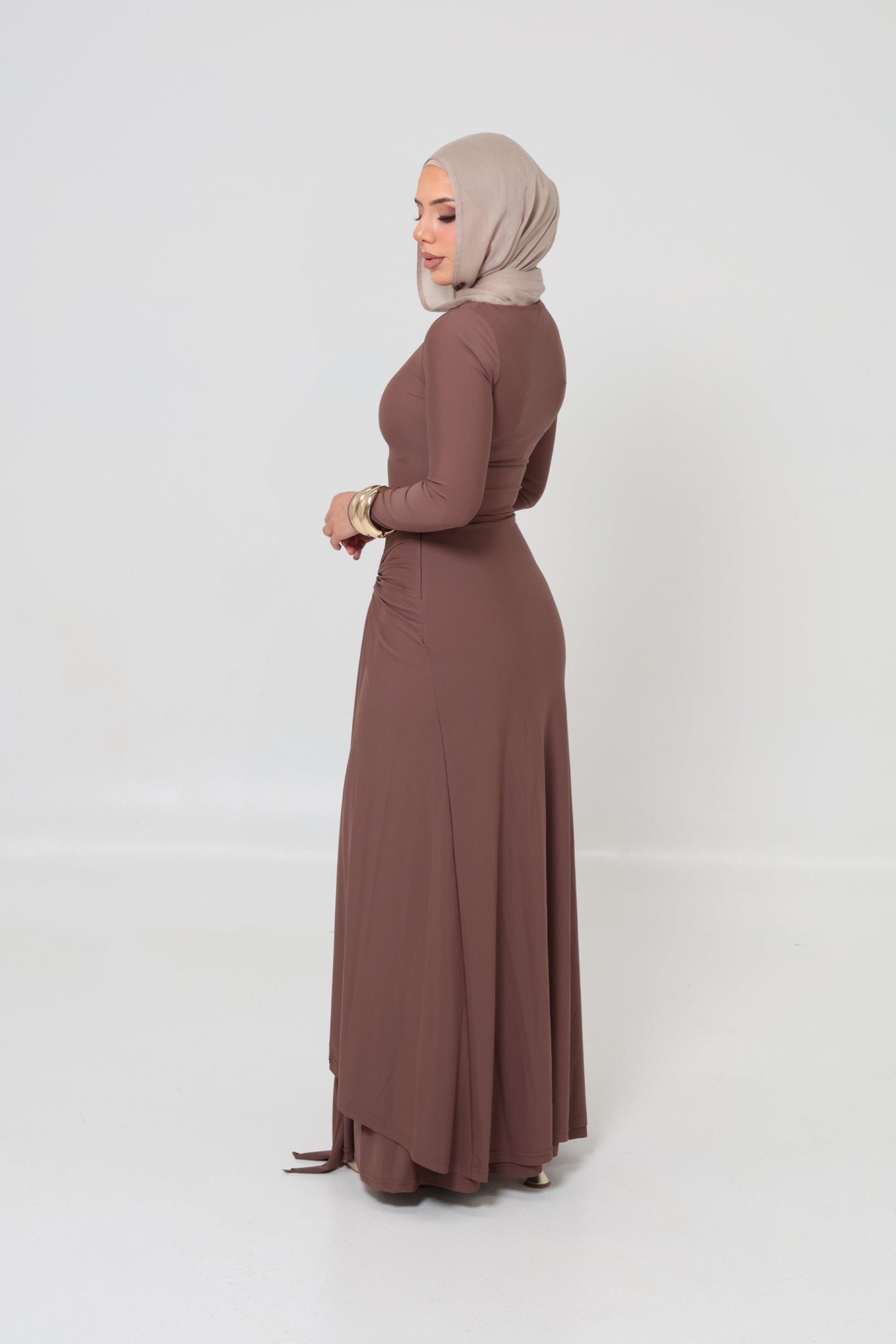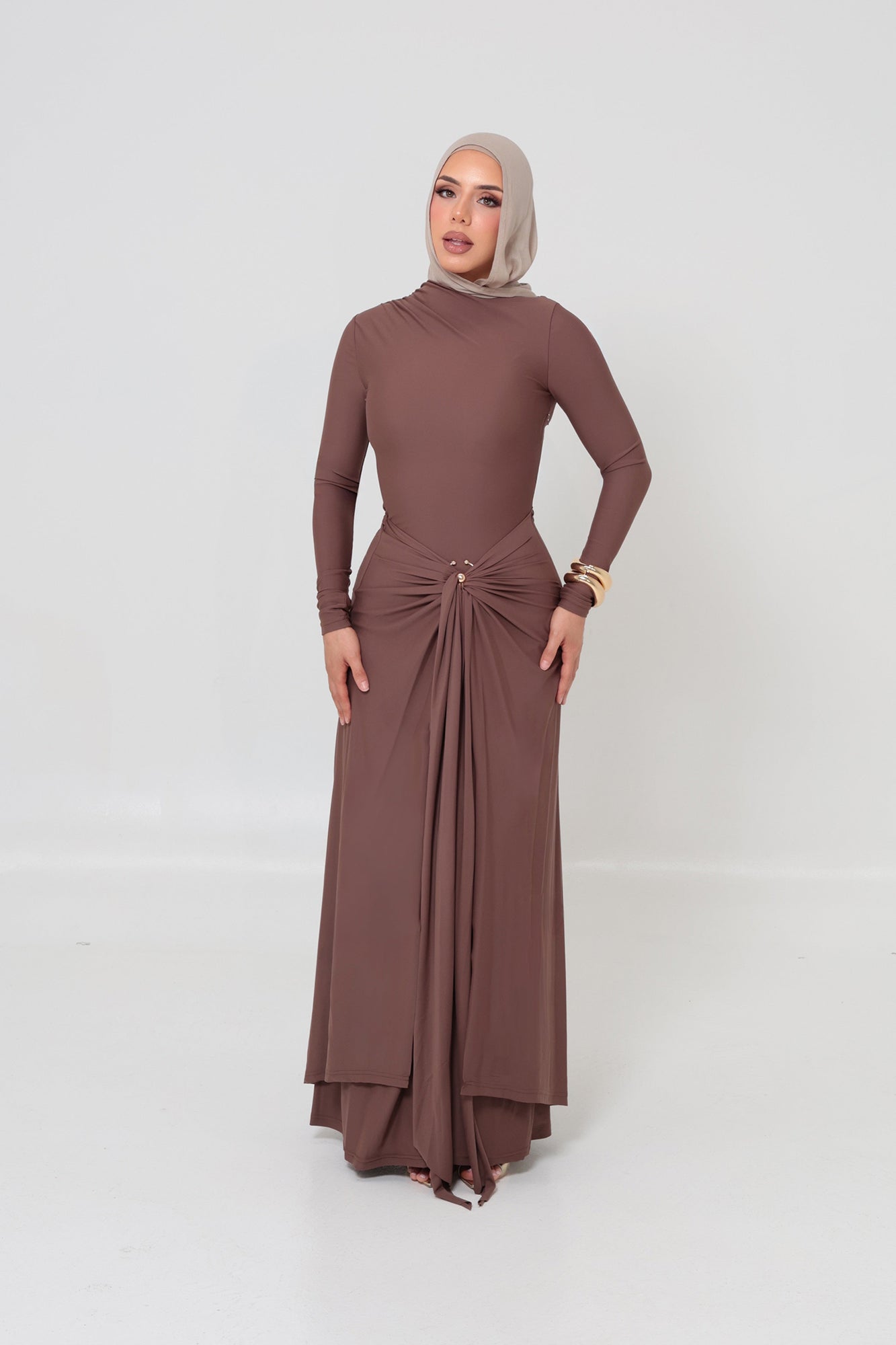 Meet the perfect blend of timeless and elegance: our Yasmin, slightly refined from the original version. This soft, flowing piece drapes beautifully over your frame, creating a flattering silhouette that moves with you. It's standout feature includes it's drapery and gold buckle at the mid-waist.