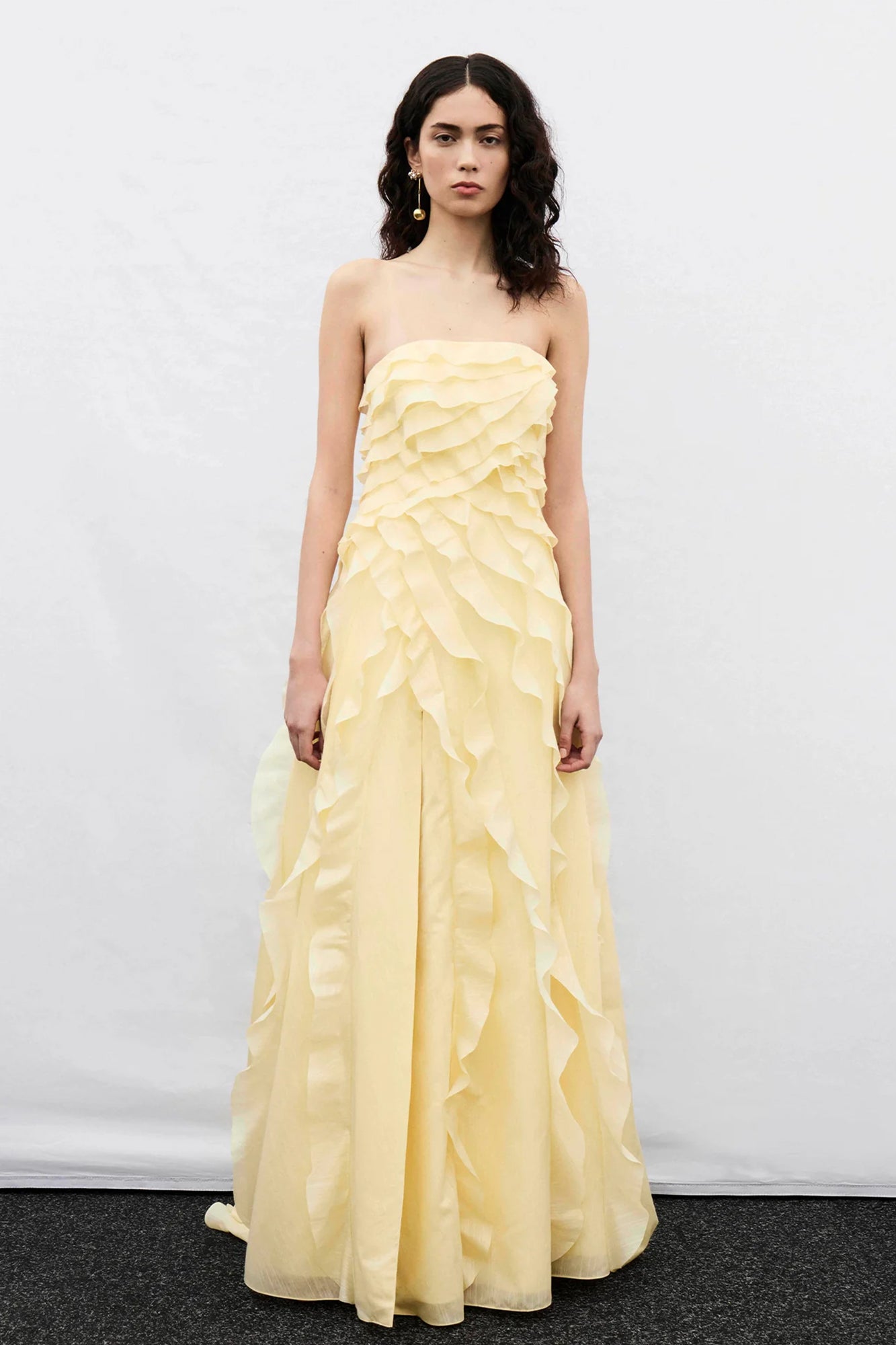 As Seen on the Resort ’26 Runway, the Allairie Gown makes a striking statement. Designed with an elegantly fitted bodice featuring internal boning, it offers structured support while enhancing the silhouette. Irregular frill detailing throughout adds movement and modern texture, flowing into a voluminous skirt for dramatic impact. Finished with a concealed zip, hook-and-eye closure and a fully lined interior for comfort and coverage.