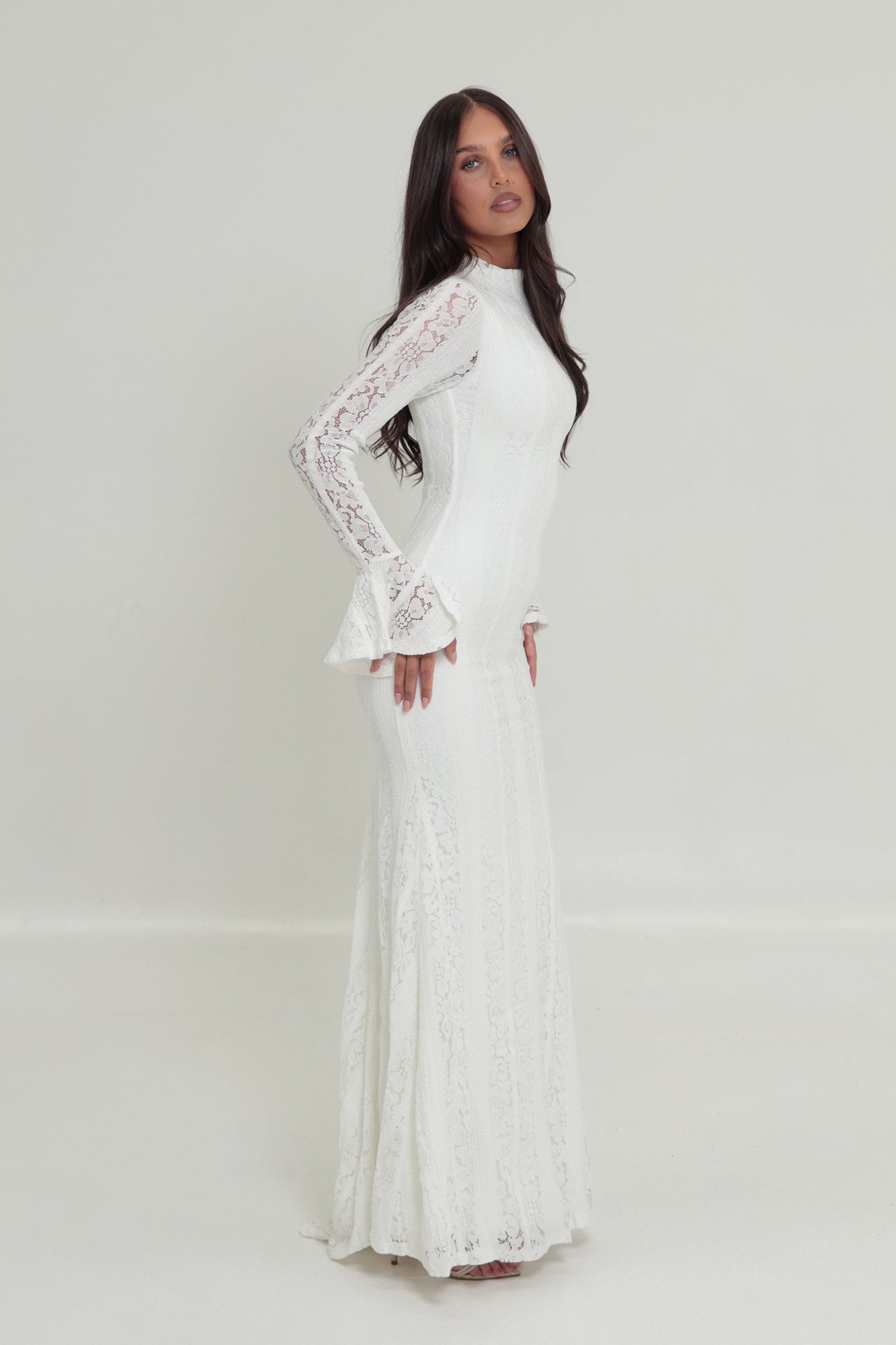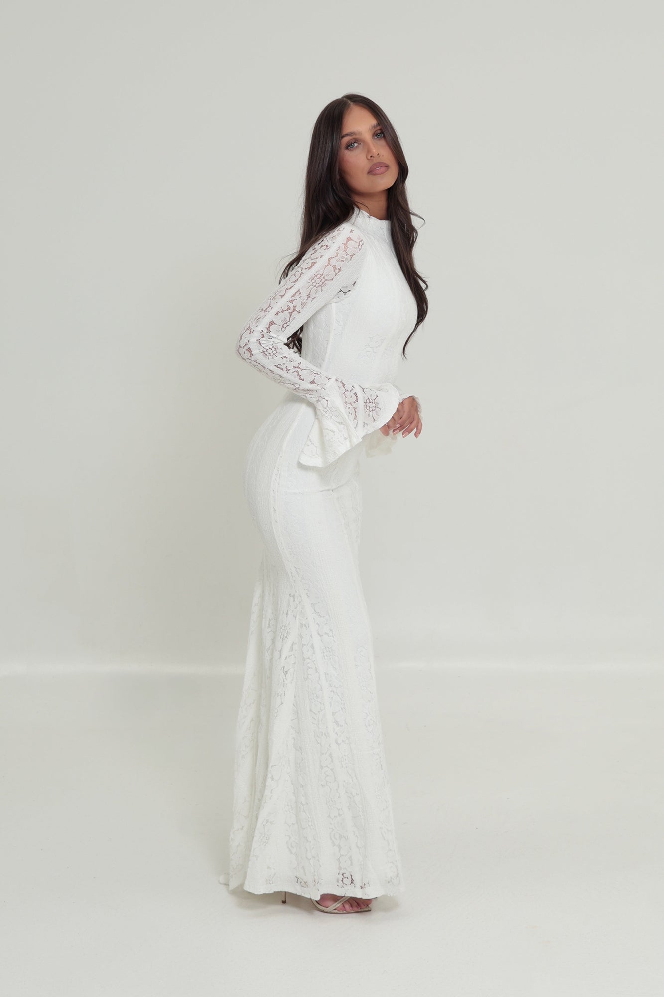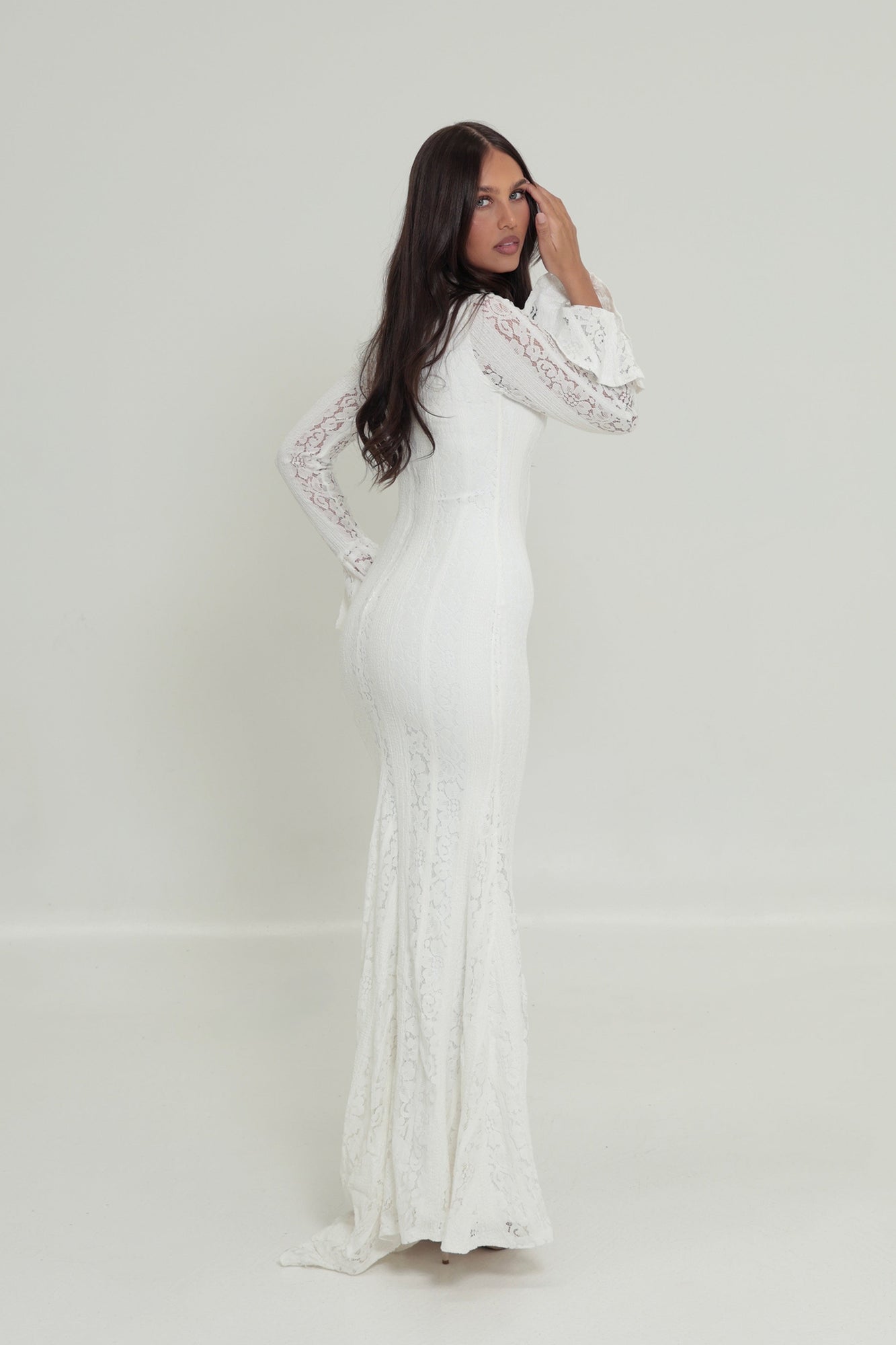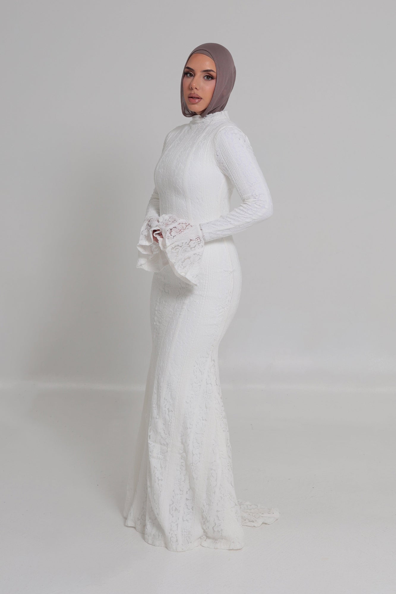 The fluted cuffs add a romantic touch, and the flowing godet skirt creates a dramatic sweep with every step.