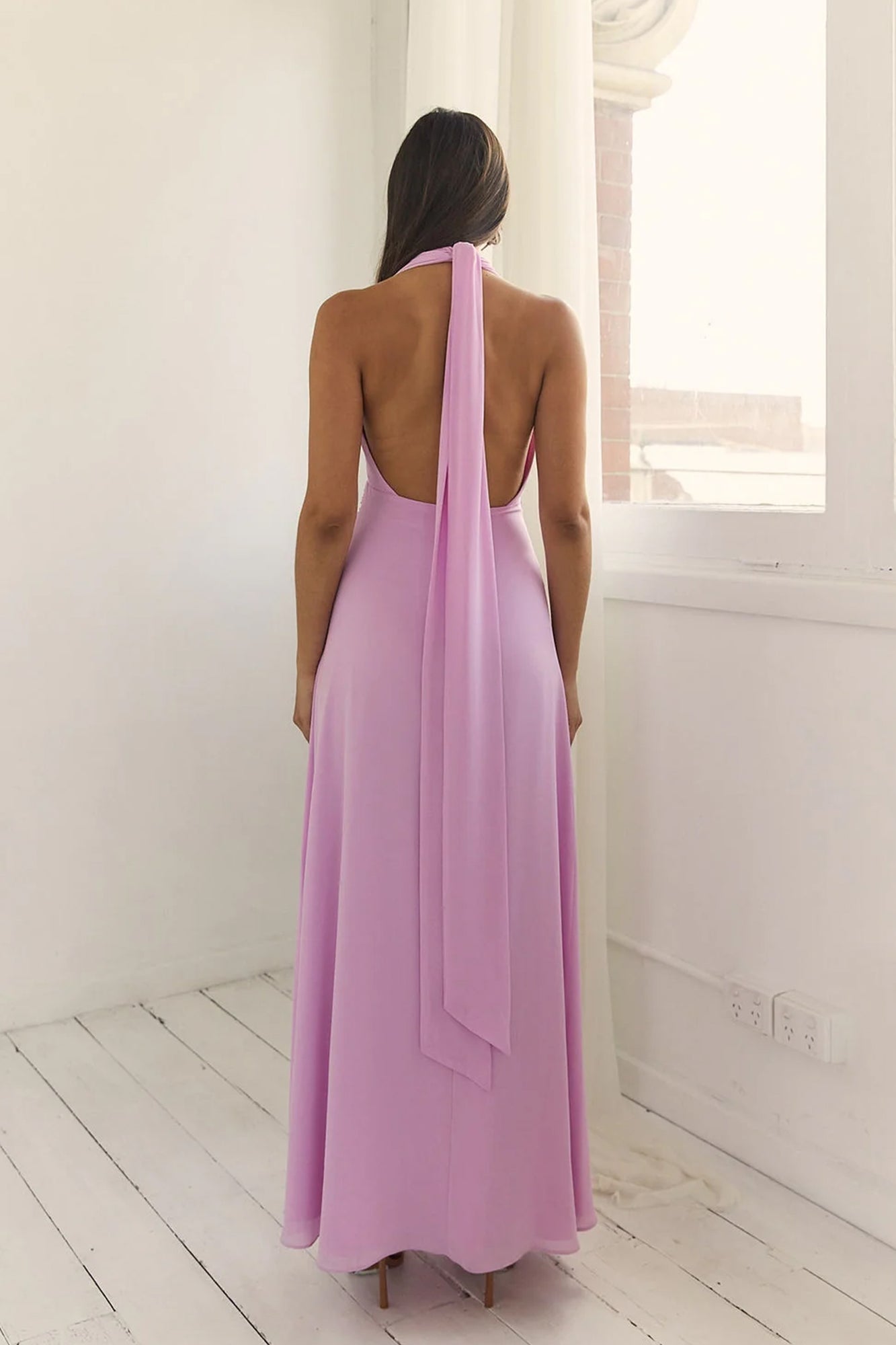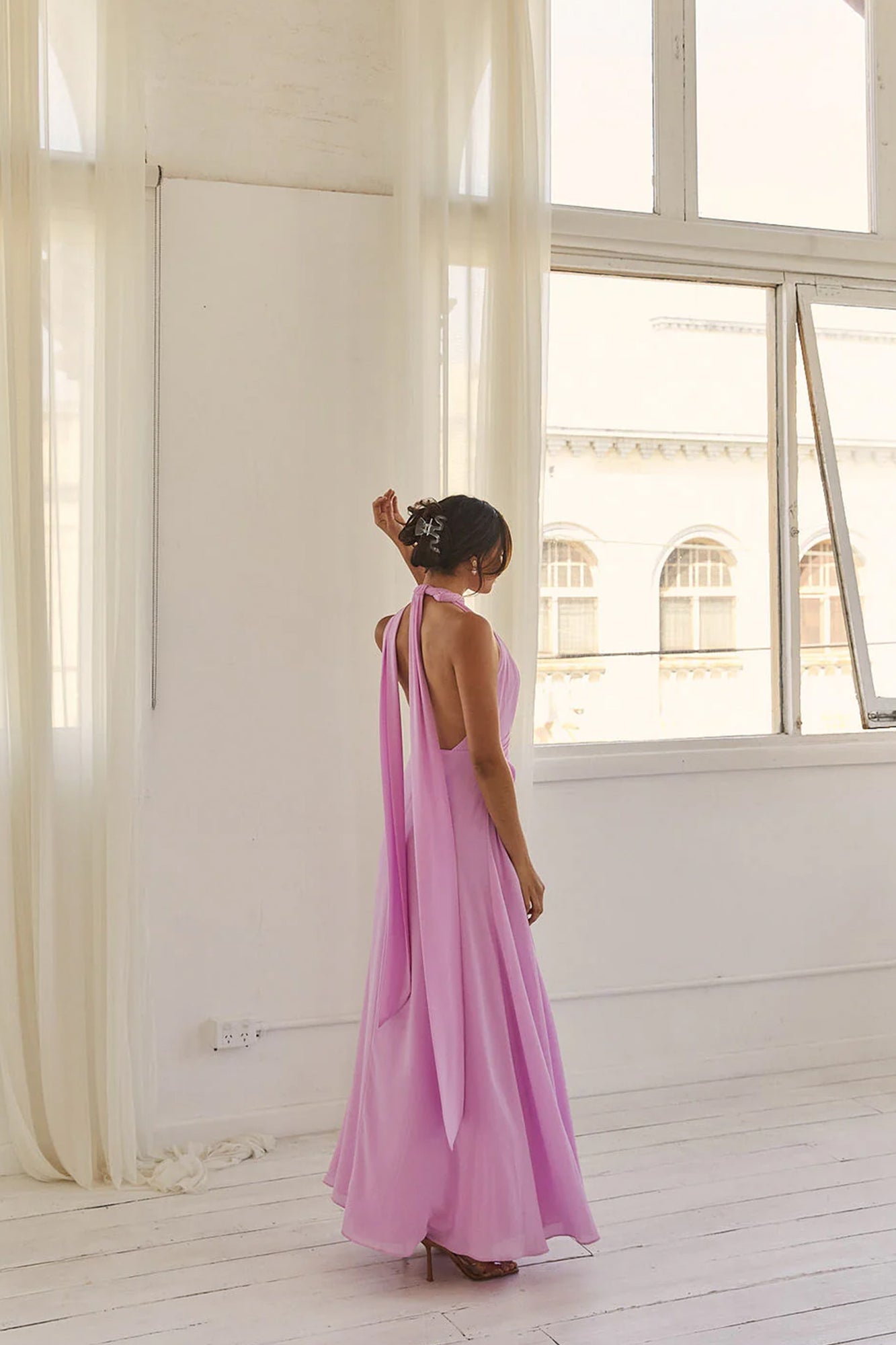 With romance in mind, meet Antonia. The perfect balance between flirty & sweet. Crafted from a luxurious and delicate georgette in soft pink. Her elegant design drapes over the body and cinches the waist with pleated detailing to flatter and accentuate the feminine curve. Finely finished with a statement leg split for a stand out touch. Antonia is a romantic classic made to last for years to come.