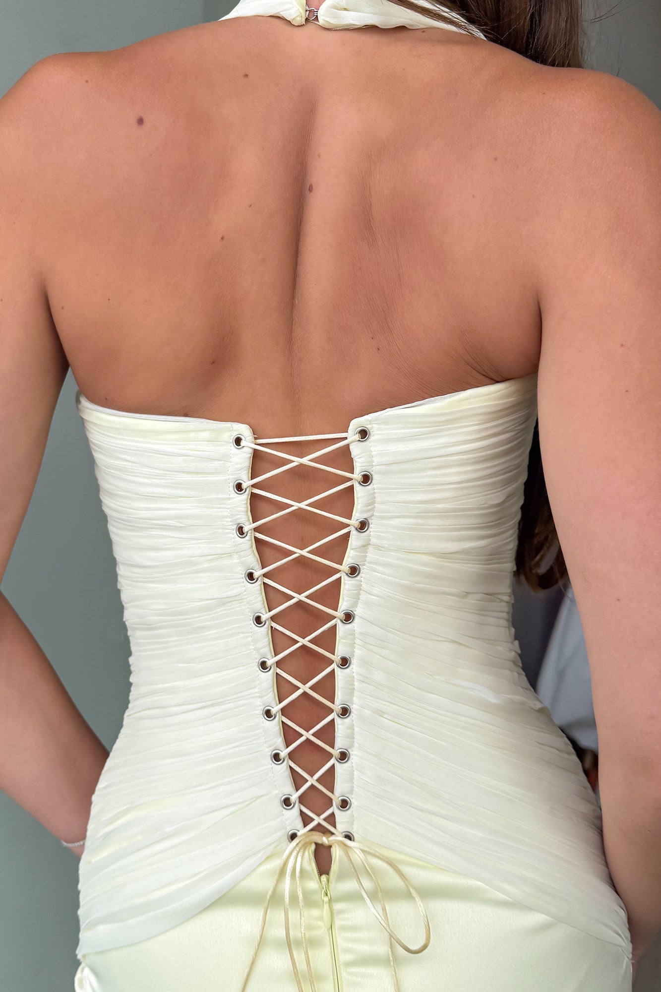 Make an unforgettable entrance in the Lola Sorbet Yellow Corset Gown, a statement piece that captures timeless elegance and modern glamour. This gown features a structured, ruched bodice that cinches the waist and a halter neckline that enhances the silhouette. The lace-up back detail allows for an adjustable fit, while the figure-skimming skirt flows effortlessly to the floor, creating a flawless, sculpted look from every angle.