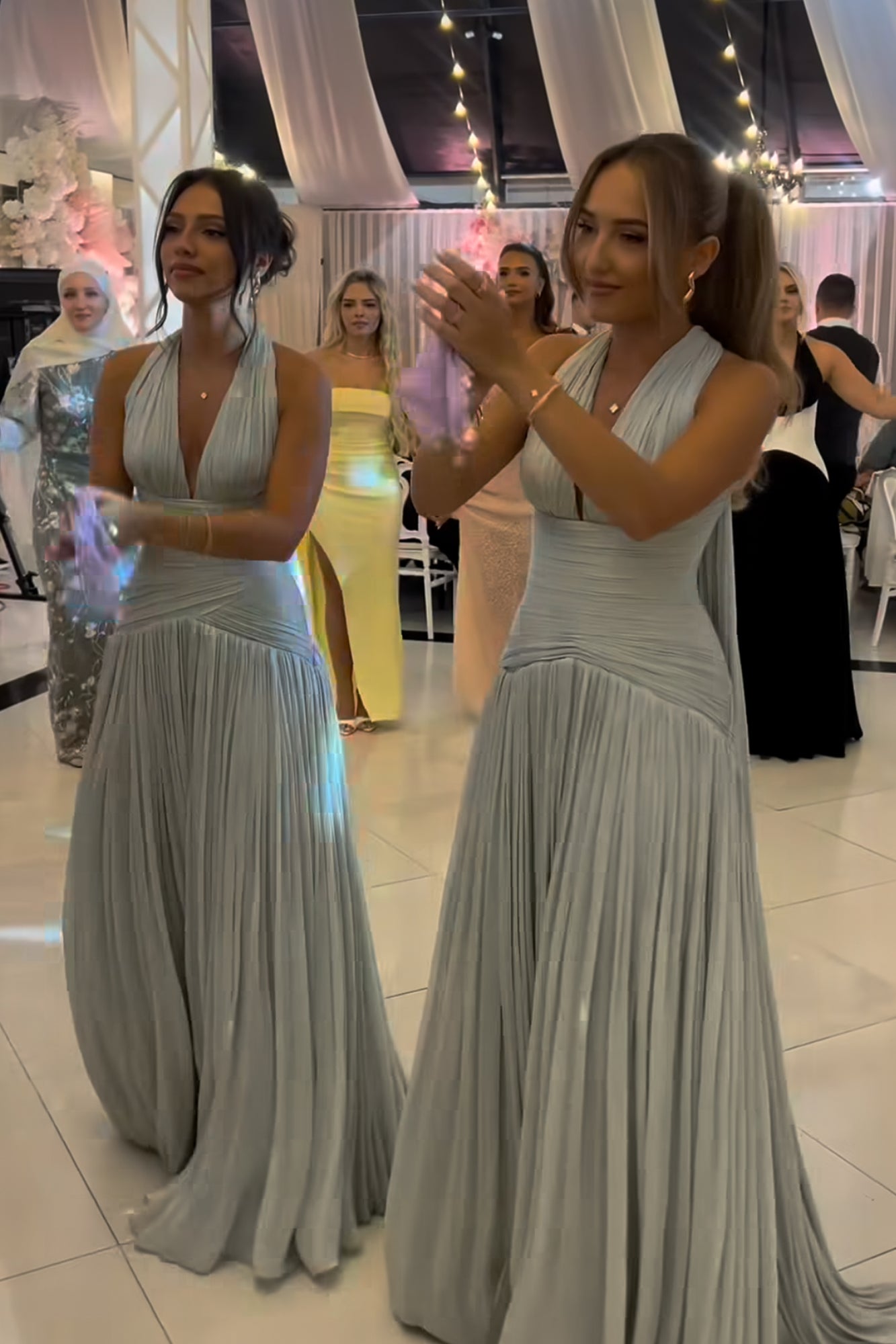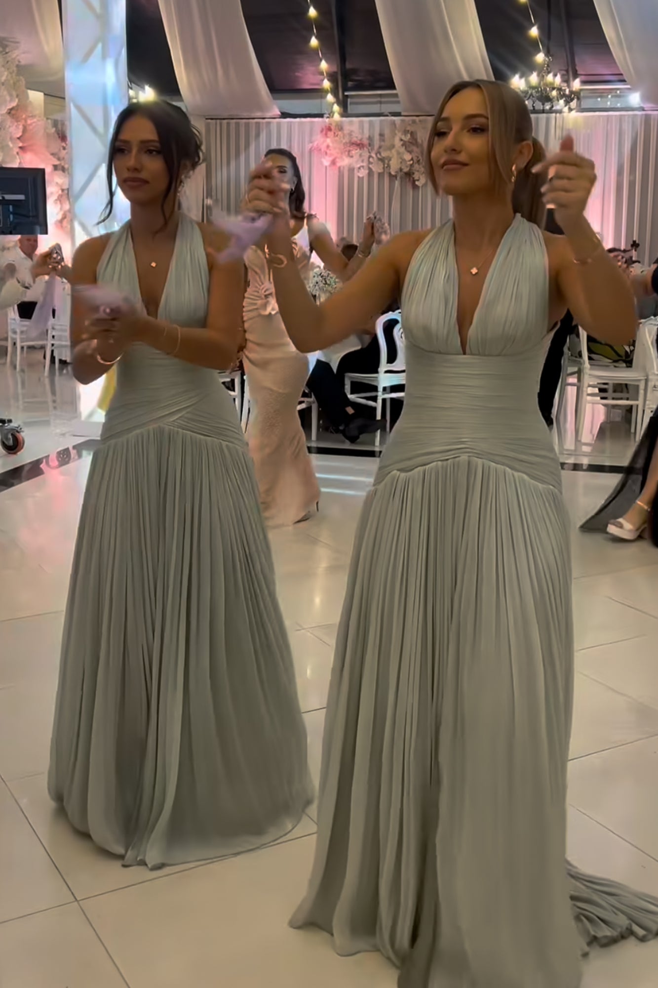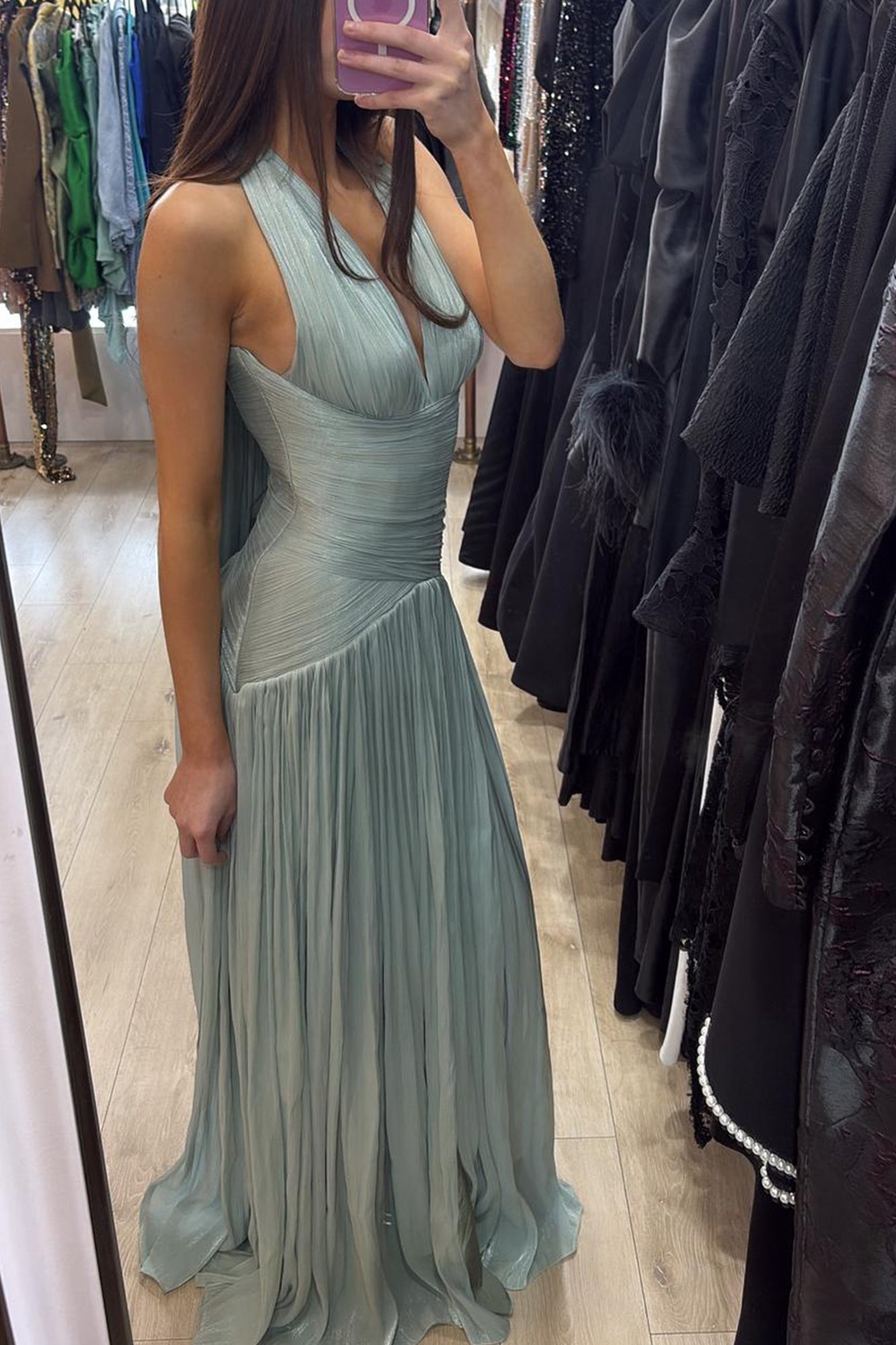 INTERNATIONAL EXCLUSIVE. Turn heads in the Lyra Corset Gown, a breathtaking floor-length silhouette designed to sculpt and flatter. Featuring a plunging halter neckline with delicate ruching, the gown seamlessly transitions into a flowing pleated skirt that moves with effortless grace. The structured corsetry back provides a secure fit while accentuating the waistline. Crafted in a soft, metallic pastel hue, this gown is perfect for evening soirées, weddings, and black-tie moments.