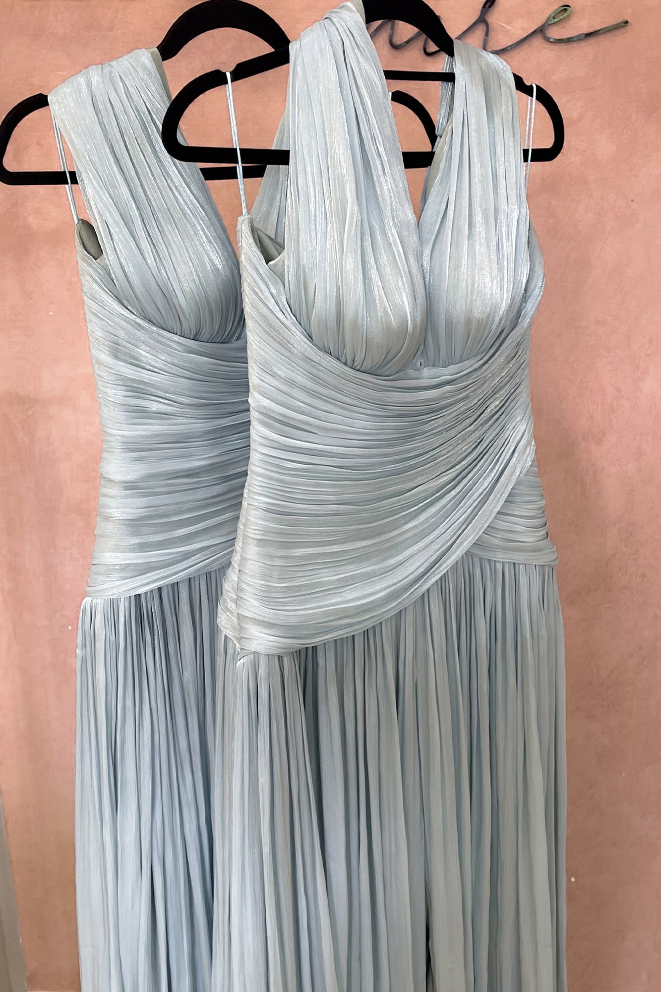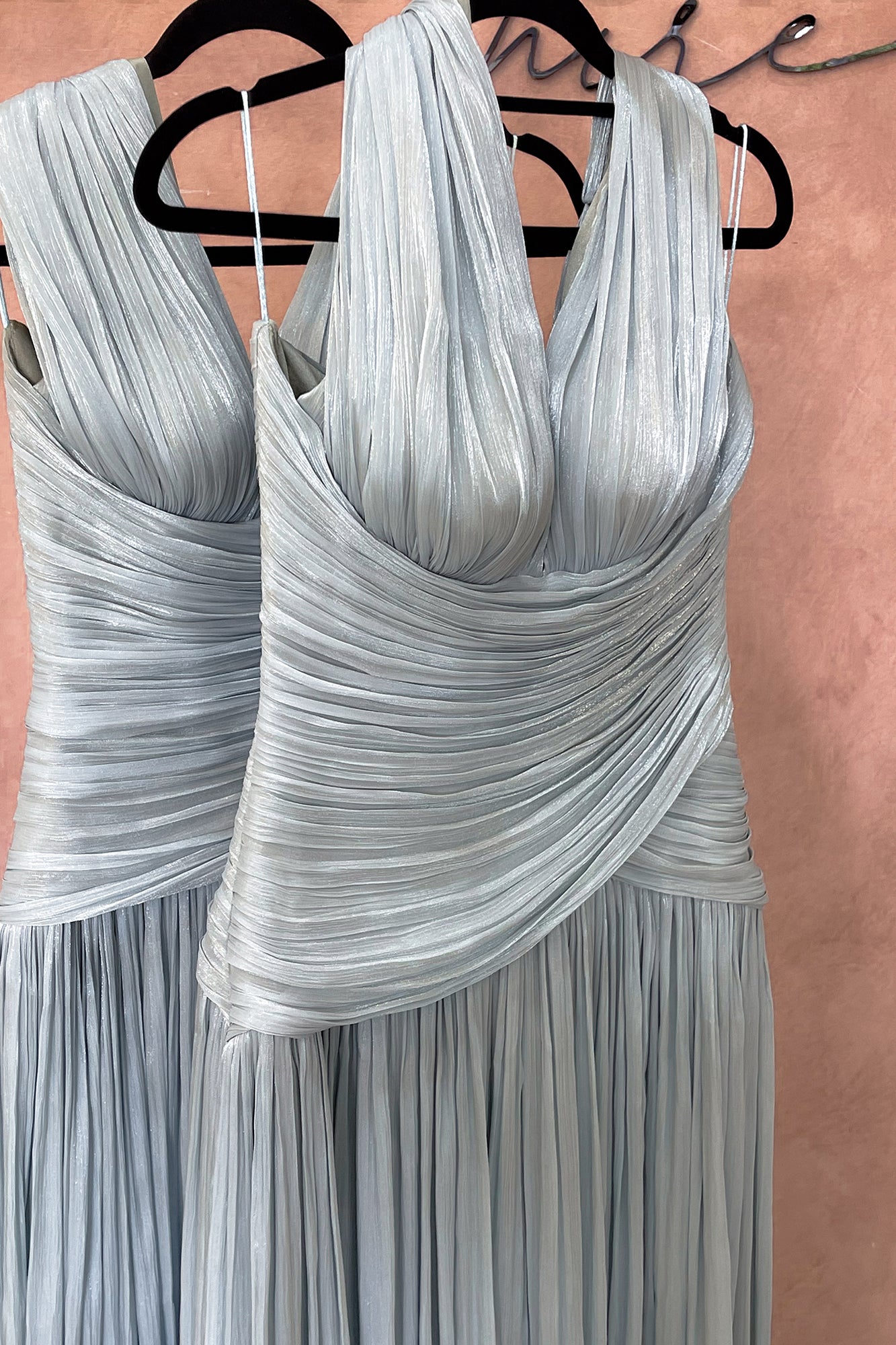 Care Note: Due to the delicate nature of the fabric, we recommend avoiding rings, bracelets, or sharp accessories when dressing to prevent pulls. Please also avoid placing handbags or clutches with textured surfaces directly against the gown.