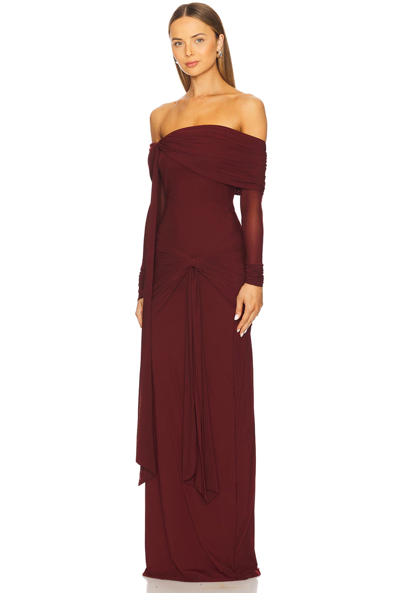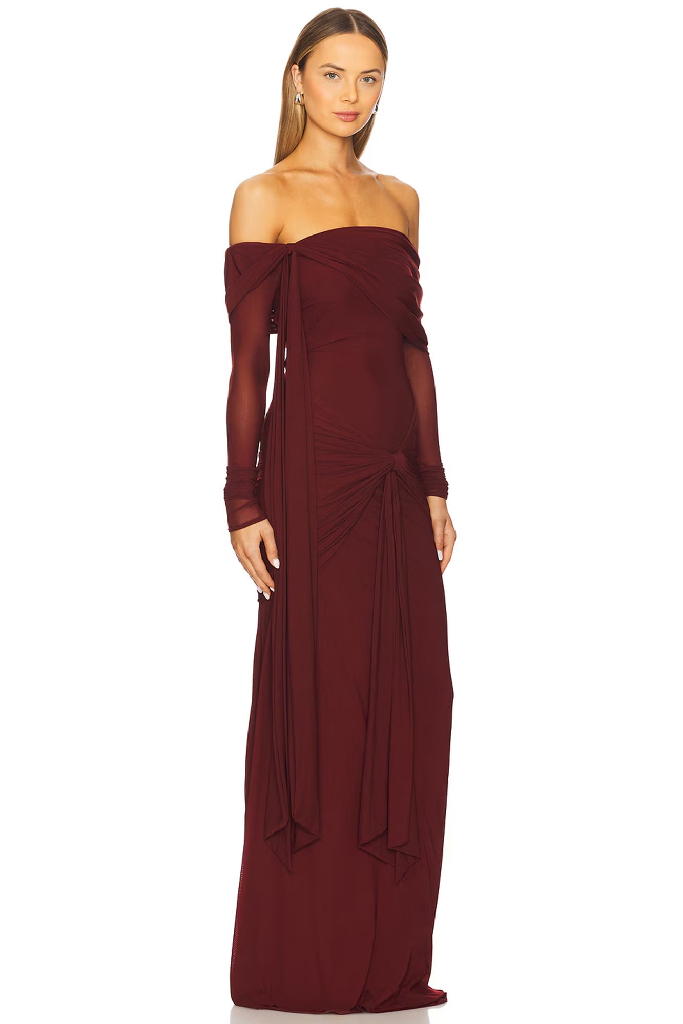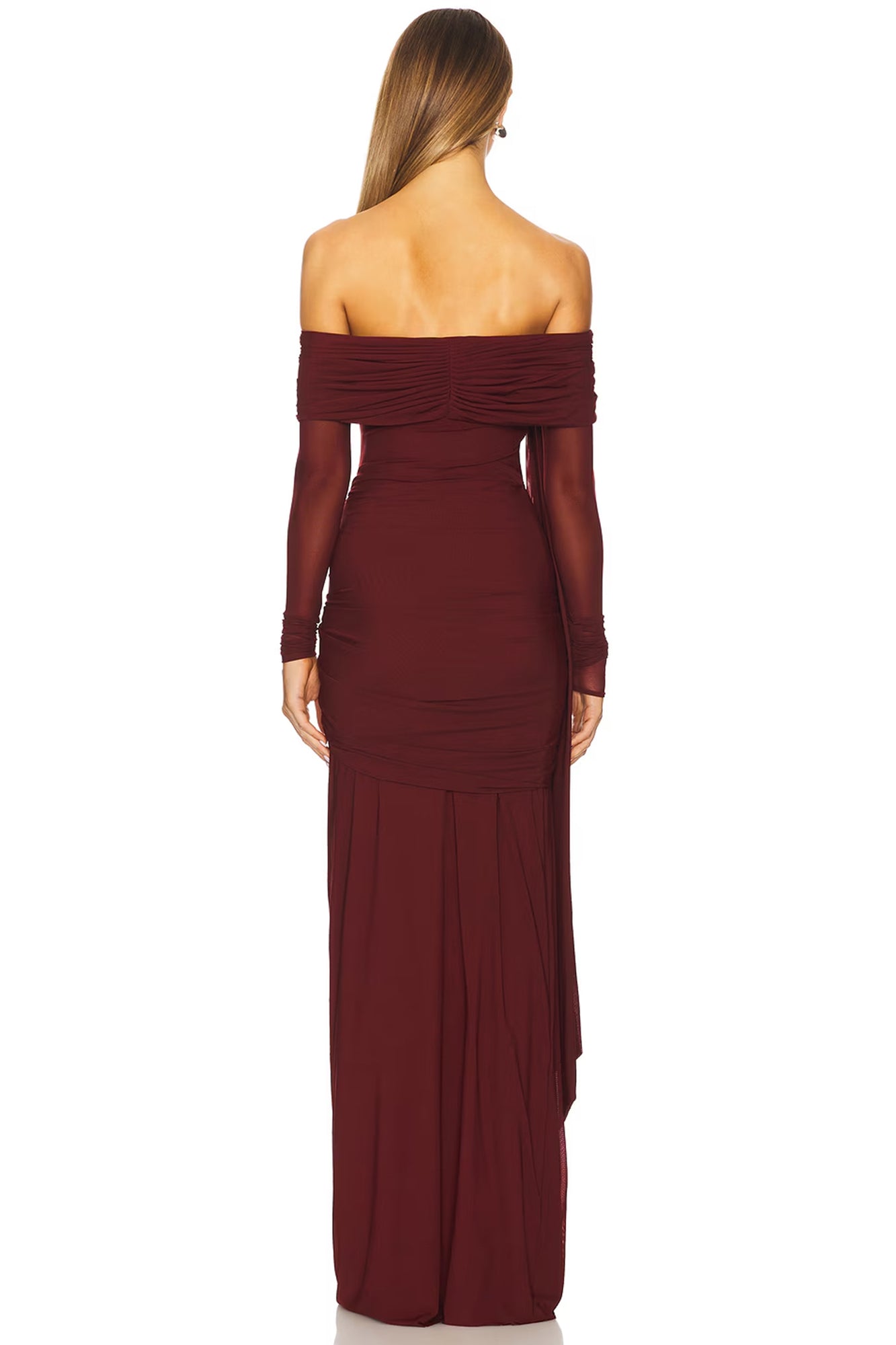 INTERNATIONAL EXCLUSIVE. The gown is a breathtaking off-shoulder piece made from a sheer, ethereal mesh that drapes softly over the body. The delicate ruched panels on the shoulders and hips add texture and depth, while intricate tie-up details enhance the gown’s romantic allure. The off-shoulder neckline accentuates the collarbone, creating a graceful, feminine silhouette. Flowing and light, this dreamy gown exudes an otherworldly elegance, perfect for a fairytale-like appearance.